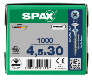 SPAX platkop, kruiskop Z, met kopboring (Ø 2,5 mm), gehard, glijcoating, volledig schroefdraad, WIROX A3J