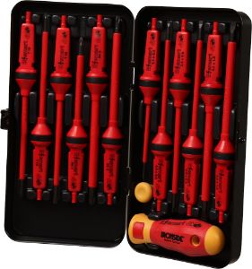 14-delig. VDE-gekeurd, geïsoleerd tot 1.000 V. Losse chroom-molybdeen-vanadiumstalen klings met zwarte punt en een ergonomisch gevormd, twee-componenten hecht voor optimale grip. Hecht voorzien van stiftsleutelfunctie.